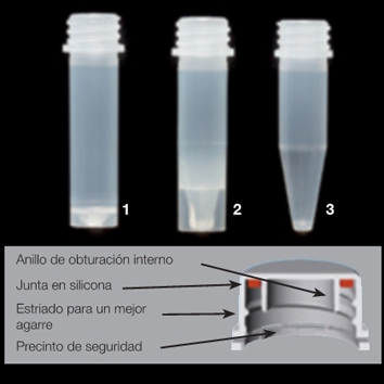 Microtubo y tapón fabricados en polipropileno ultraclaro autoclavable.