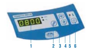2. Pulsador selector de parámetros de velocidad, temperatura o período reversible del motor.