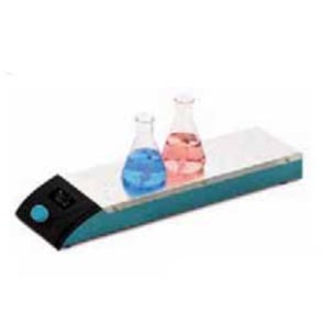 Construcción metálica con plataforma superior en acero inox. AISI 304 con grabado central en cada plaza que facilita la colocación del recipiente a agitar.