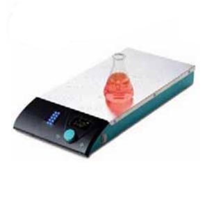 Construcción metálica con plataforma superior en acero inox. AISI 304 con grabado central en cada plaza que facilita la colocación del recipiente a agitar.