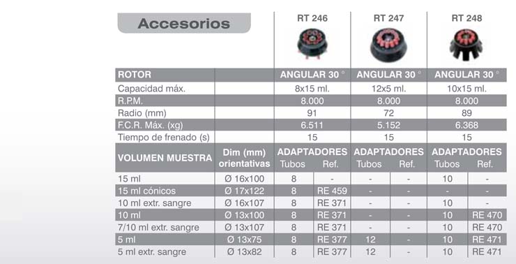 Rotores, adaptadores y tubos, accesorios no incluidos con el equipo. Se tienen que pedir aparte.