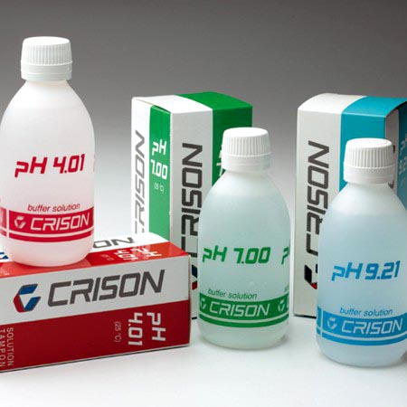 CRISON ofrece 3 disoluciones, listas para su uso inmediato, cuyos valores a 25 °C son pH 4.01, 7.00 y 9.21.