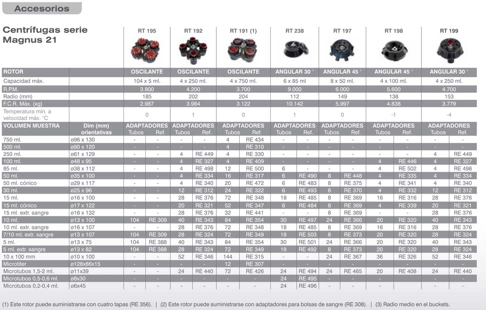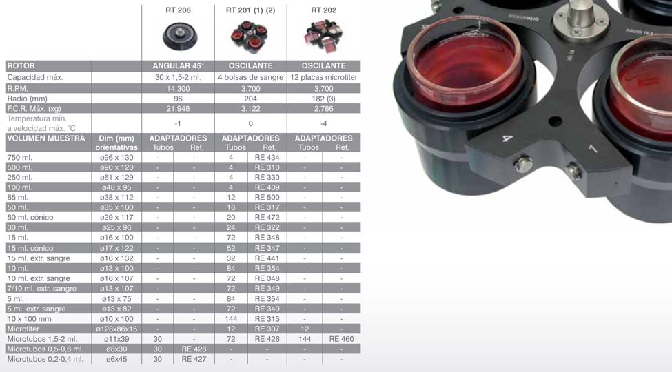 Rotores, adaptadores y tubos, accesorios no incluidos con el equipo. Se tienen que pedir aparte.