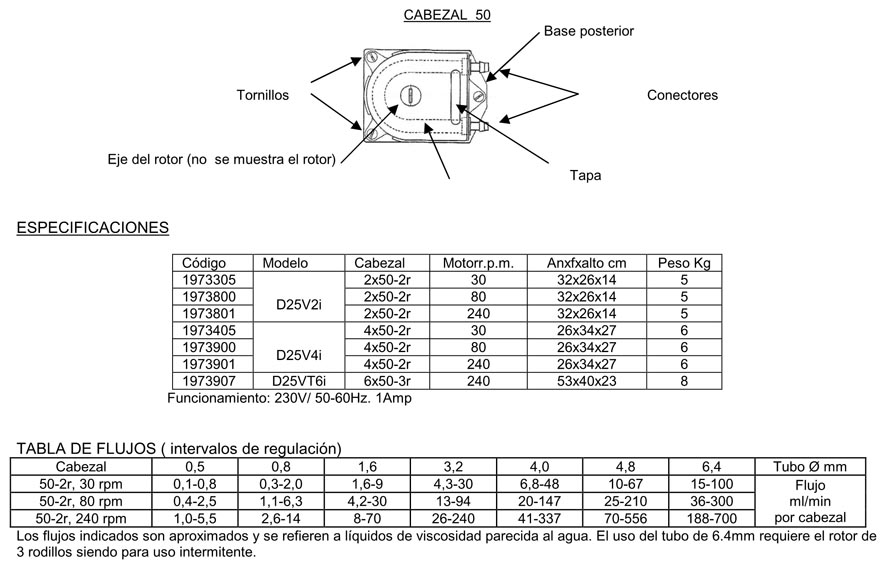 - Caudal variable de 0,4 a 300,0 ml/minuto. (Según tubo utilizado, por cabezal.)